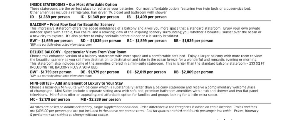 All rates are based on double occupancy, single supplement additional. Price difference in the categories is based on cabin location. Taxes and fees are $406 per person and are not included in the above per person rates. Call for quotes on third and fourth passenger in a cabin. Prices, itinerary & performers are subject to change without notice.